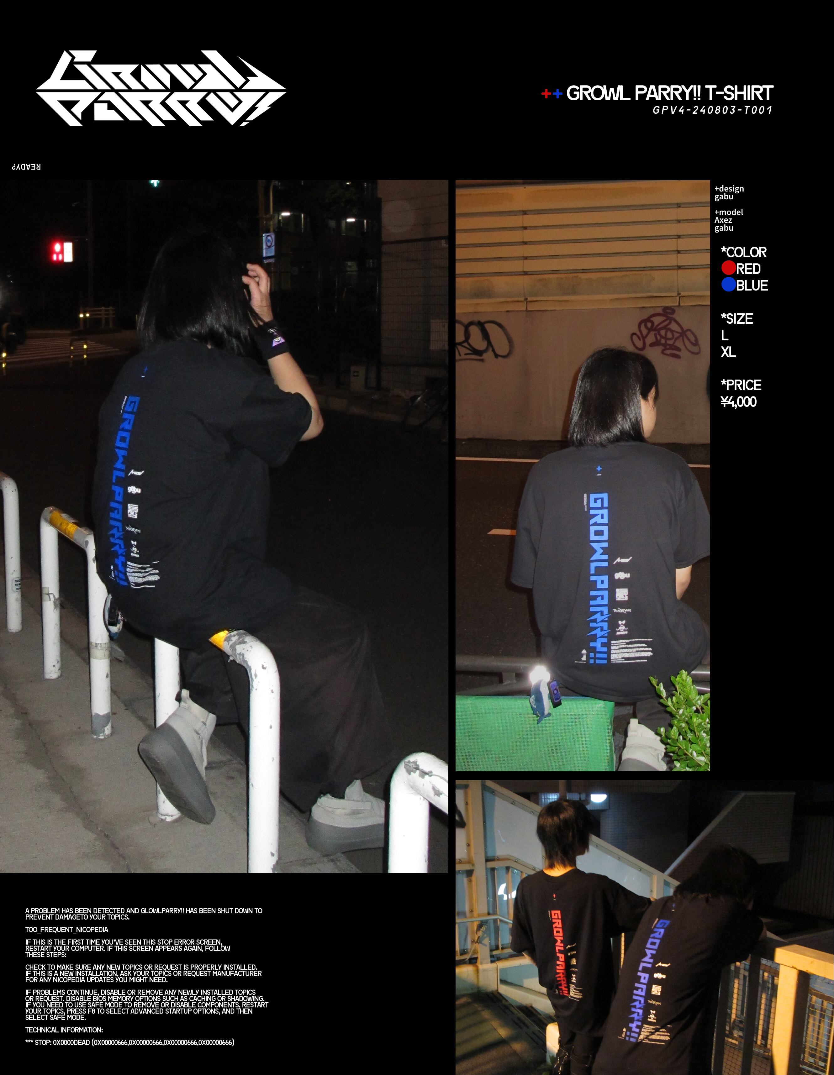 ・24/08/03に行われたGROWLPARRY!!ver.4の2color展開のTシャツです。前面にはGPロゴ、背面には演者のアイコンロゴがシルクスクリーンでデザインされています。